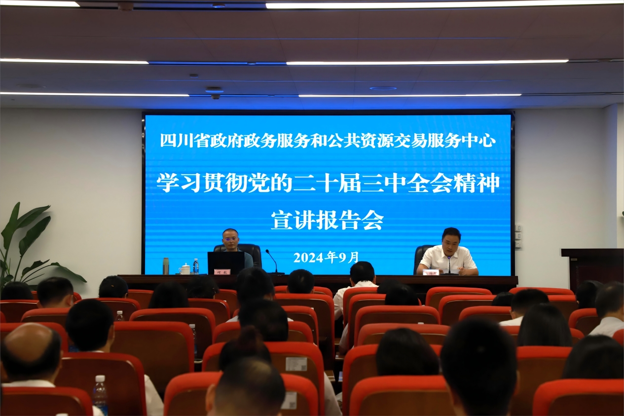 9月4日,省政務(wù)服務(wù)和資源交易服務(wù)中心(以下簡稱:省中心)舉行學(xué)習(xí)貫徹黨的二十屆三中全會精神宣講報告會。四川師范大學(xué)何毅教授作專題宣講報告。省中心領(lǐng)導(dǎo)班子成員,全體干部職工,駐省中心各窗口首席代表共計100余人參加宣講報告會。