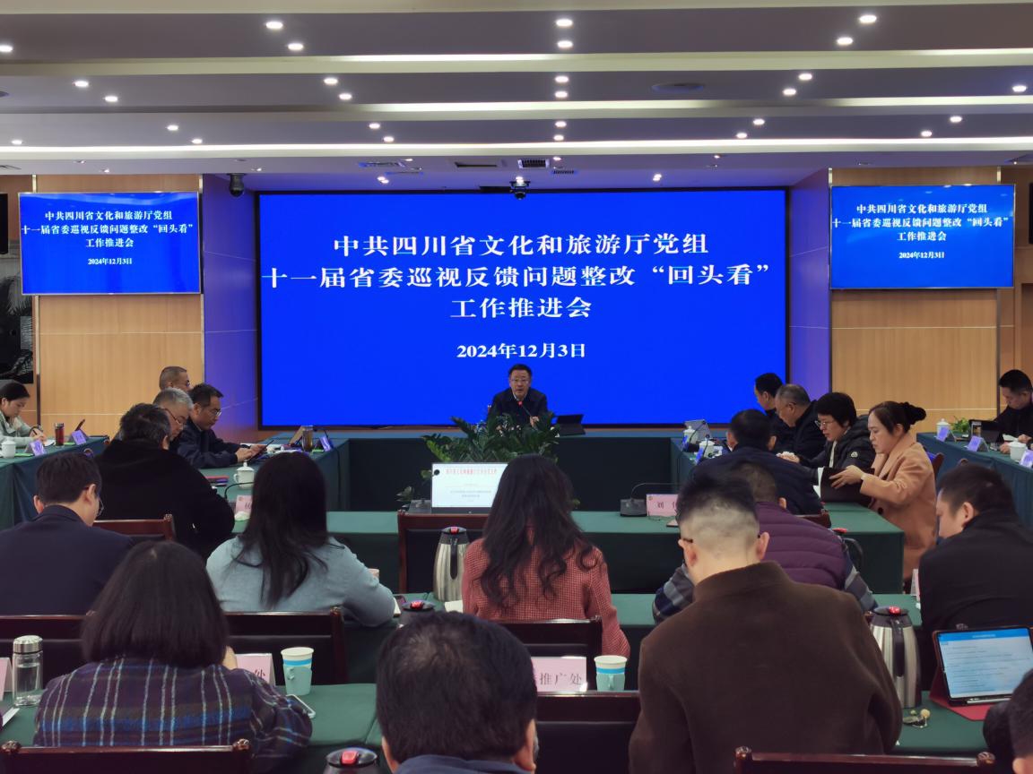 12月3日,文化和旅游廳黨組書記、廳長戴允康主持召開十一屆省委巡視反饋問題整改“回頭看”工作推進(jìn)會(huì)。會(huì)議審議通過了《中共四川省文化和旅游廳黨組關(guān)于十一屆省委巡視反饋問題整改“回頭看”情況的報(bào)告》,聽取了駐廳紀(jì)檢監(jiān)察組反饋的巡視整改工作意見,對重點(diǎn)整改事項(xiàng)進(jìn)行專題研究,安排部署下一步工作任務(wù)。