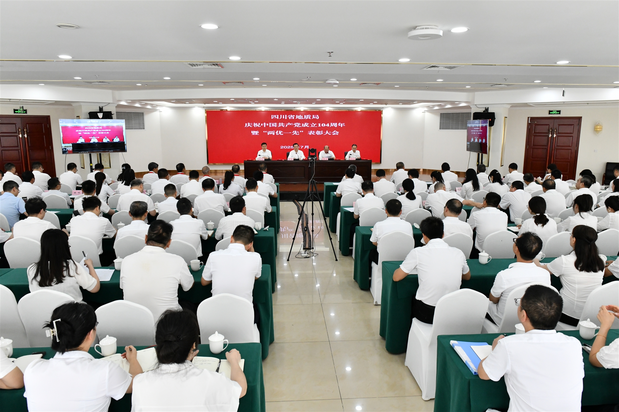 7月10日下午,伴隨著莊嚴(yán)嘹亮的國(guó)歌聲,省地質(zhì)局慶祝中國(guó)共產(chǎn)黨成立104周年大會(huì)在成都召開。局黨委書記、局長(zhǎng)伍定出席并講話。大會(huì)以視頻會(huì)議形式舉行,局領(lǐng)導(dǎo)、局機(jī)關(guān)全體在職黨員、“光榮在黨50年”代表和局“兩優(yōu)一先”個(gè)人、集體代表等150余人在主會(huì)場(chǎng)參會(huì)。?