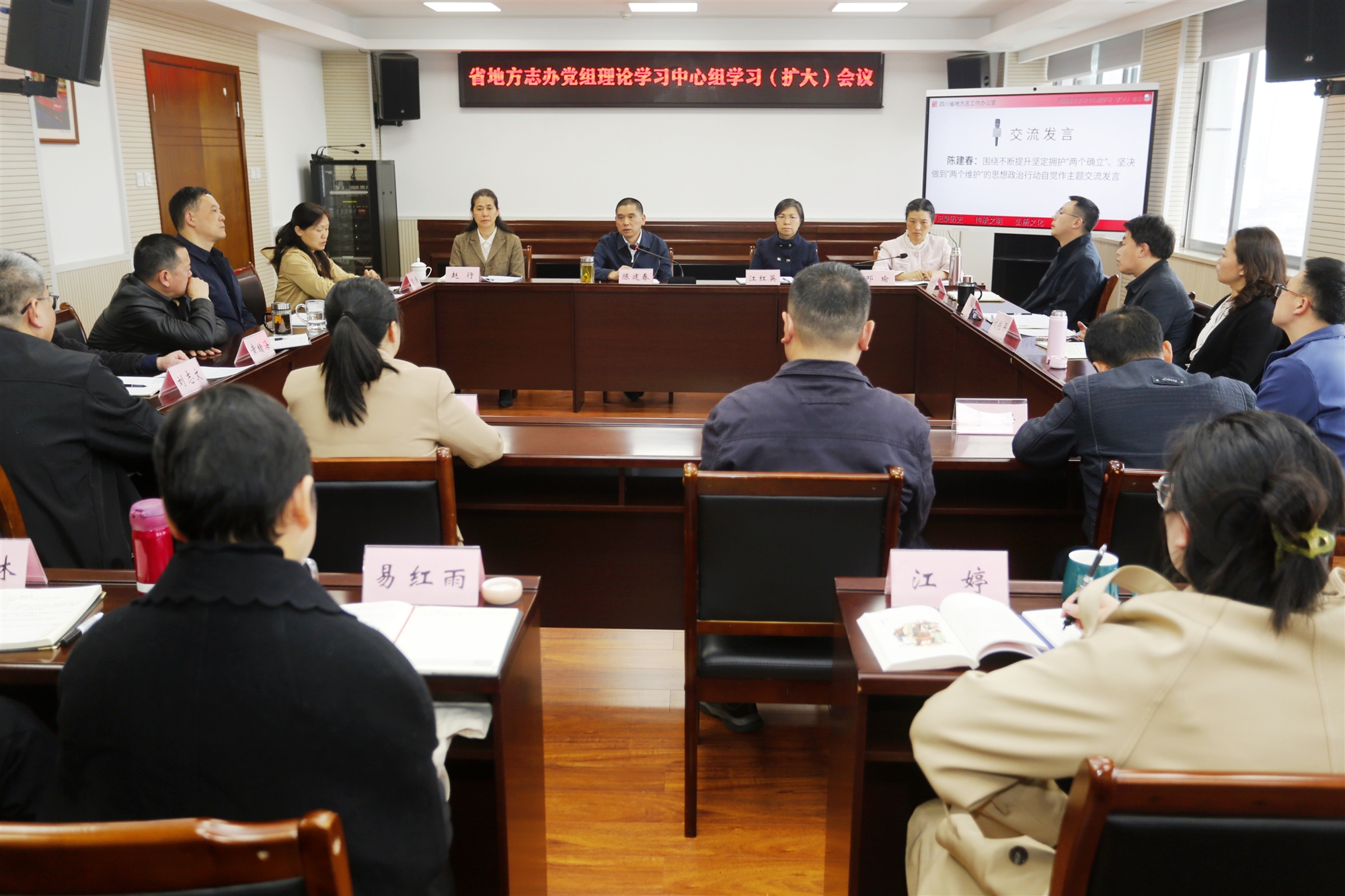 3月27日,省地方志辦召開黨組理論學習中心組學習(擴大)會,專題學習研討“兩個確立”的決定性意義。會議組織觀看《深刻領悟“兩個確立”的決定性意義 堅決做到“兩個維護”》視頻,傳達學習全國兩會精神和主題教育總結會議精神及其他文件。辦黨組書記、主任陳建春主持會議并作《不斷提升堅定擁護“兩個確立”堅決做到“兩個維護”的思想政治行動自覺》主題發言。