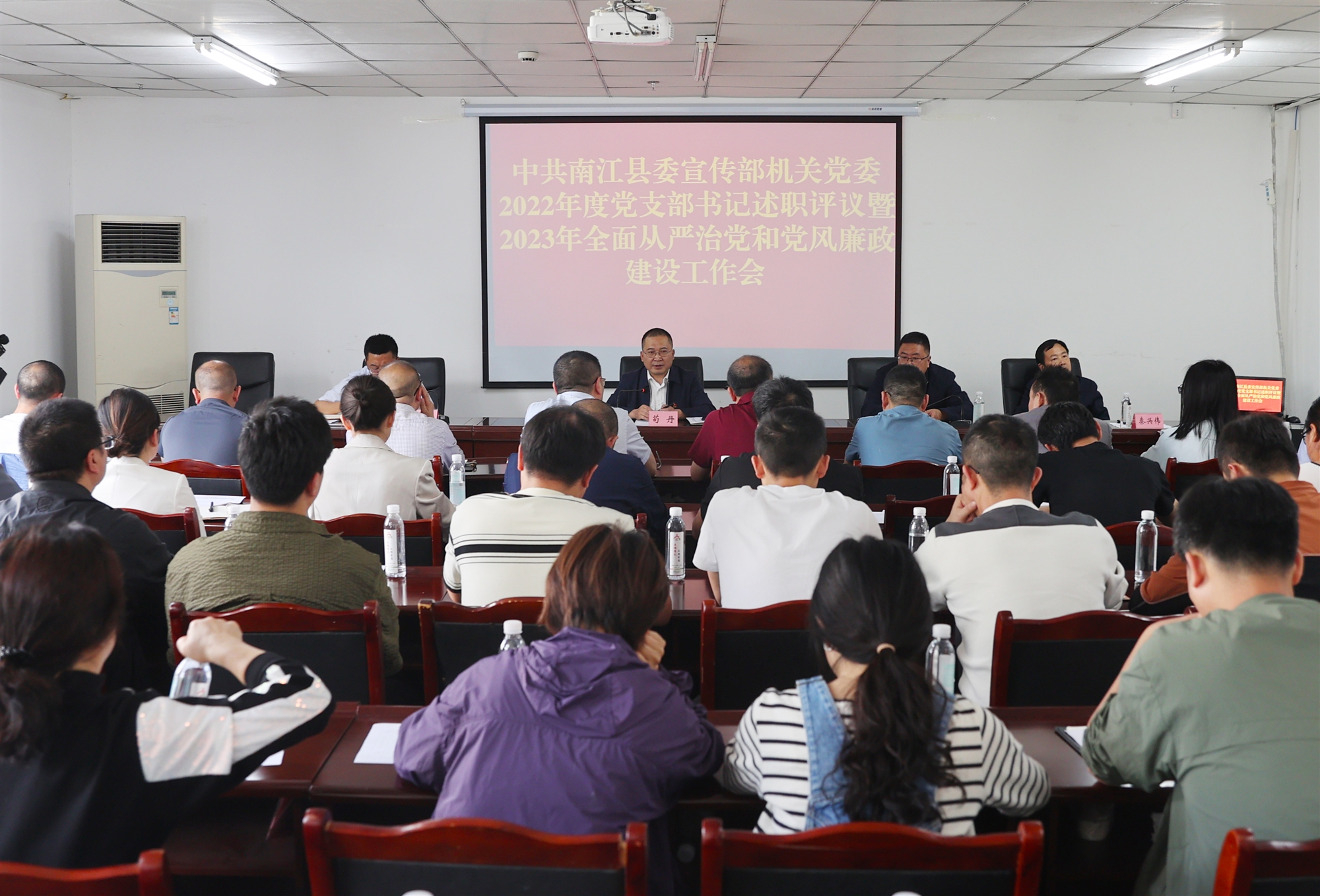 5月23日,南江縣委宣傳部機關黨委召開2022年度黨支部書記述職評議暨2023年全面從嚴治黨和黨風廉政建設工作會。縣委宣傳部機關黨支部、縣融媒體中心黨支部、新華文軒黨支部全體黨員參加。